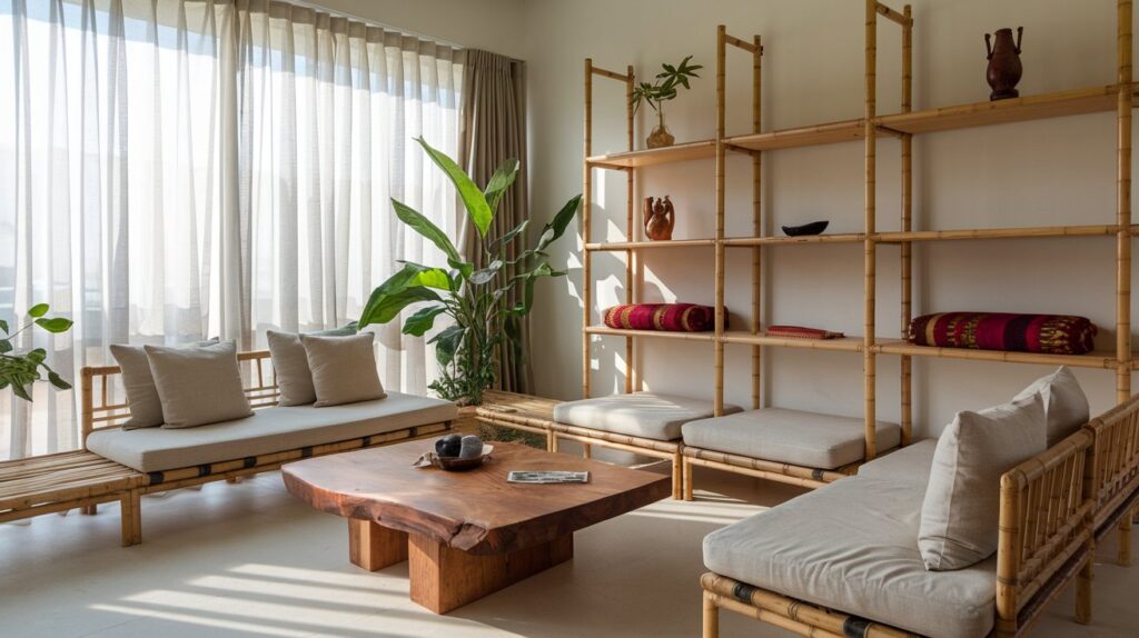 - Balconies: Weatherproof bamboo loungers with built-in storage
